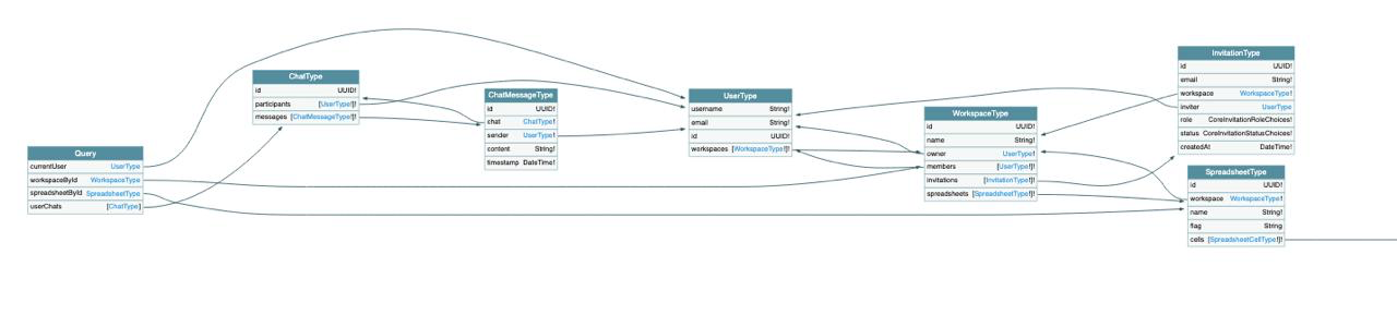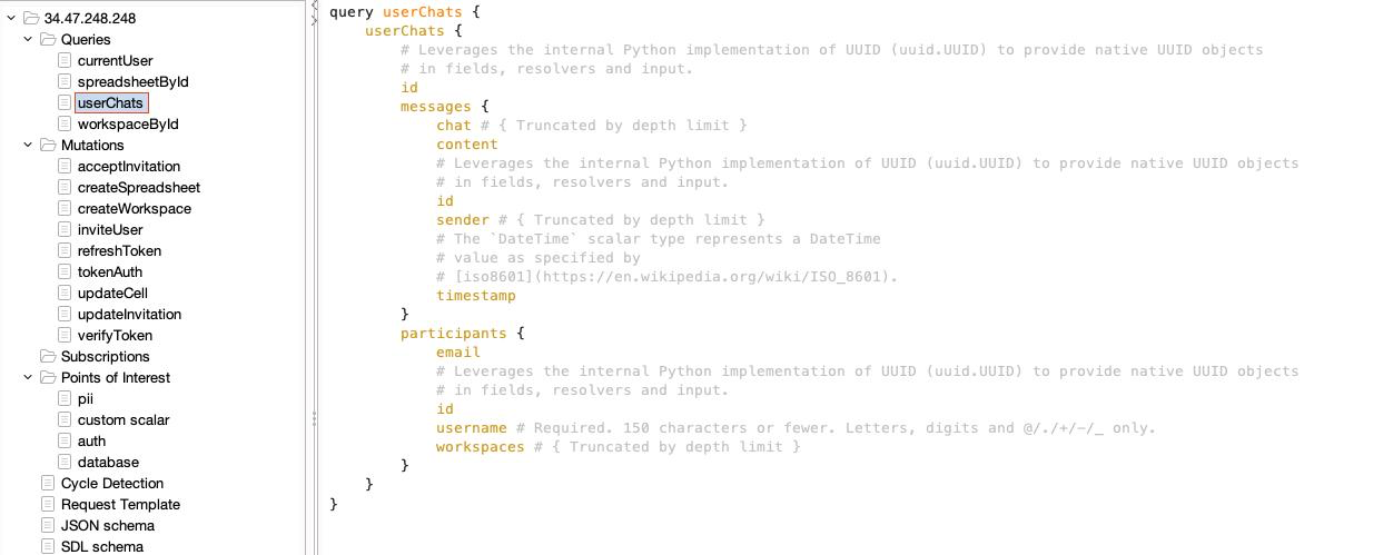 queries to dump all spreadsheets contents of the user in the chats. I started to construct my own payload based on the boilerplat and the map previously and came out as below.